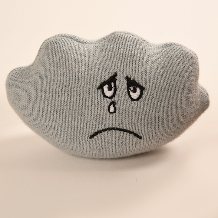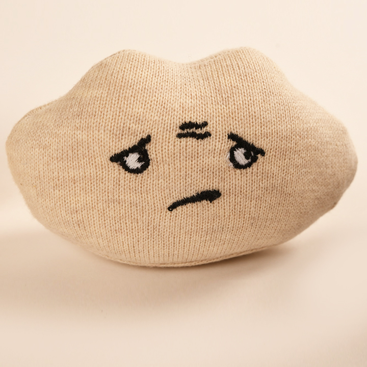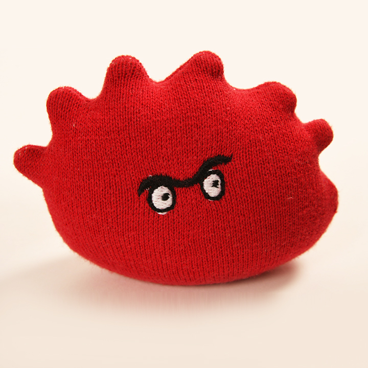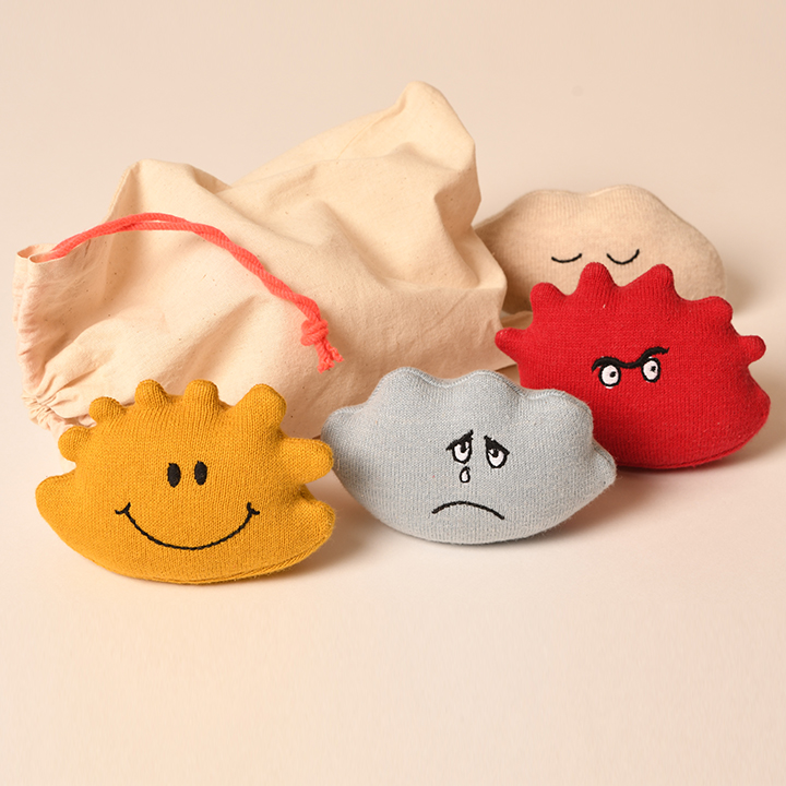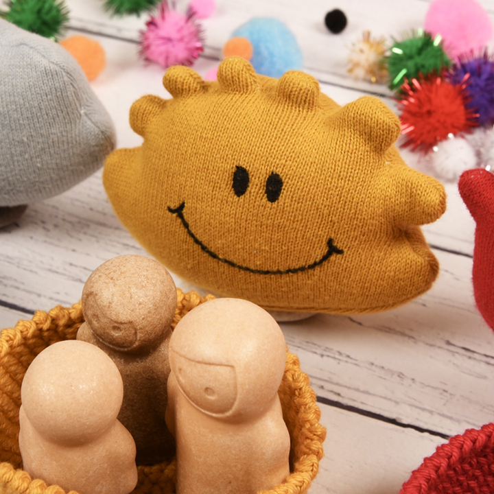 Plush characters are made from a washable soft wool knit with embroidered features.