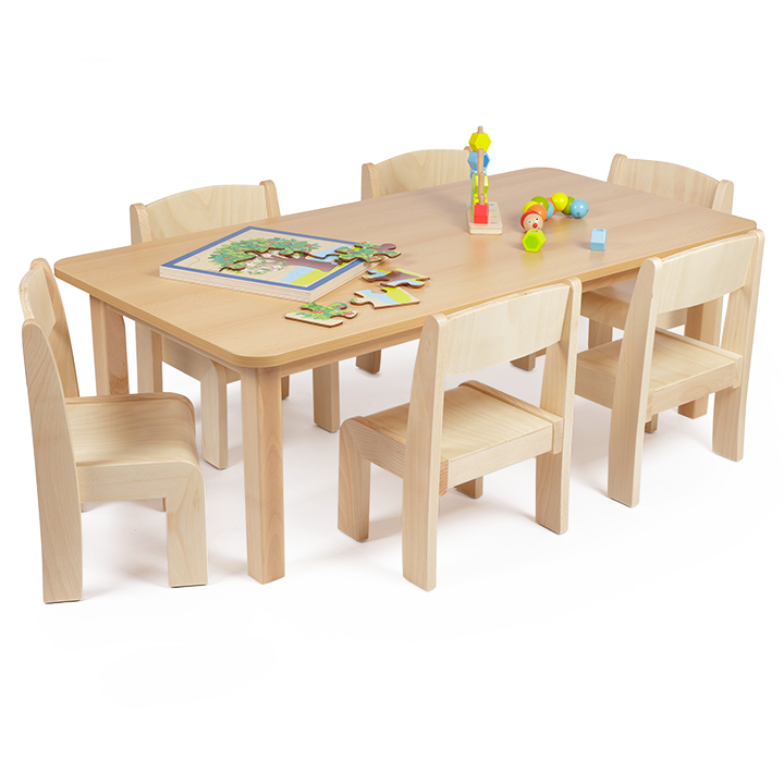 Great value set - rectangular wood effect laminate-topped table with a choice of four or six stacking chairs. Beautifully finished stackable wooden chairs and hardwearing easy to clean table with solid wood legs.