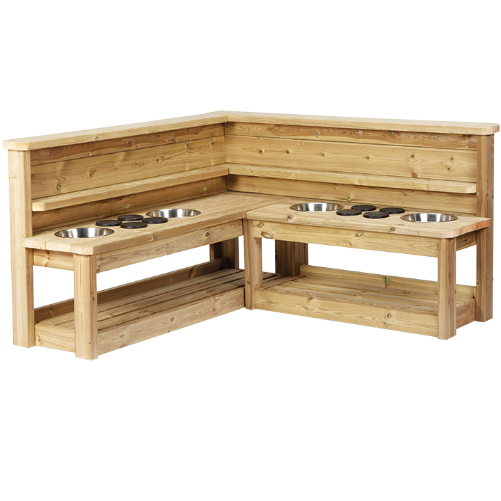 Two useful storage shelves for pots and pans and handy slots for mud kitchen utensils.