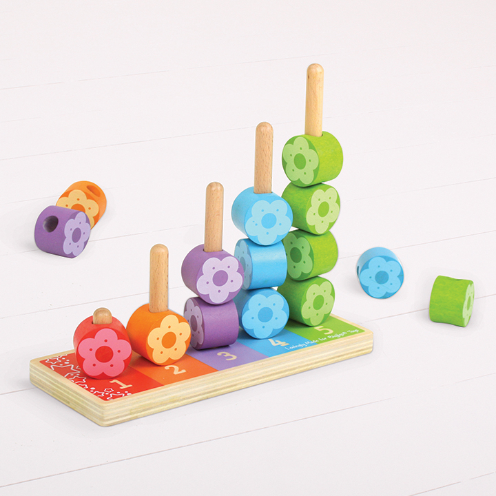 Match the coloured flowers to the correct colour on the base board and count them as you stack them up. Pegs fold flush against the board when not in use, for safety. Helps to develop dexterity and concentration. 16 pieces