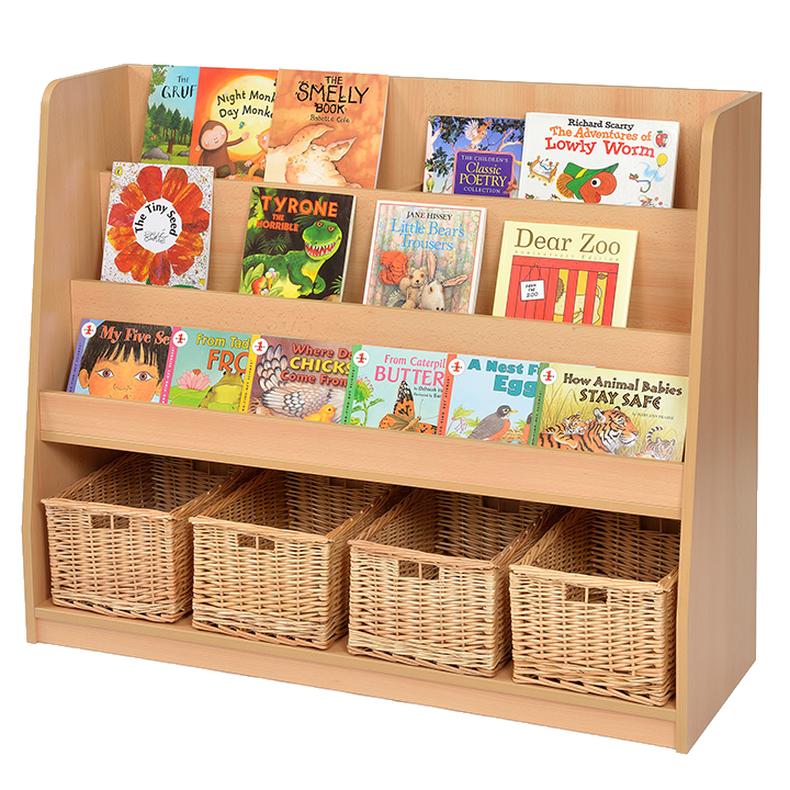 Place in line or back to back as an effective way to divide and define space. This unit displays and stores books with 3 tiered front facing shelves and ample storage below. Baskets sold separately.