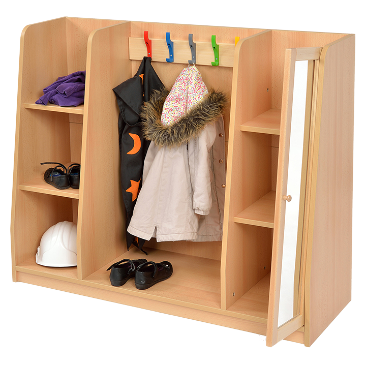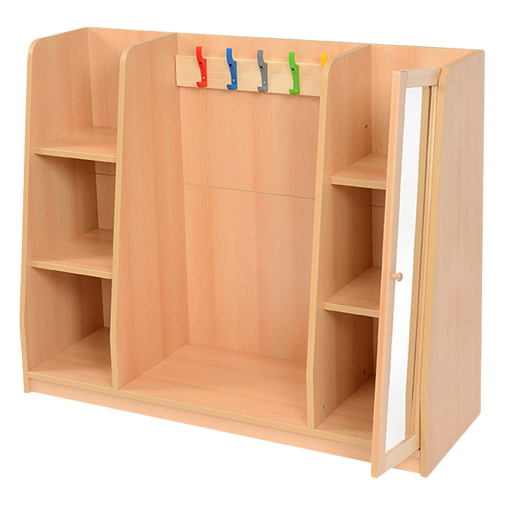Place in line or back to back as an effective way to divide and define space. This unit is designed to store a mix of dressing up items. Open shelves at one side with a mirrored door, with recessed storage shelving behind. Five multi coloured hooks.