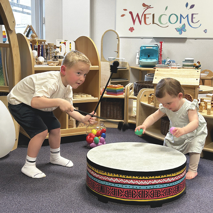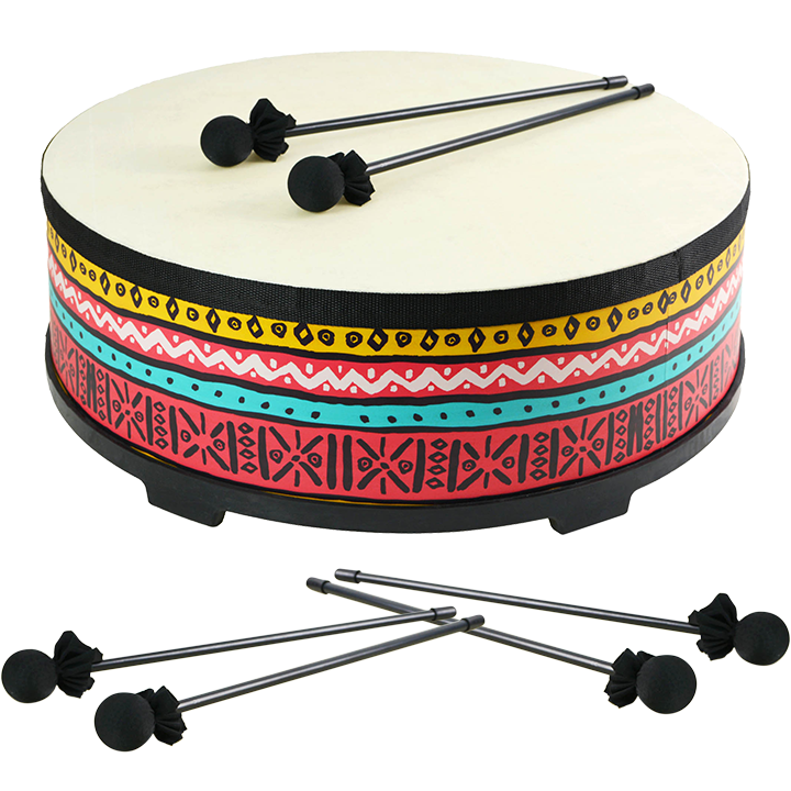 The drum has a vibrant, eye-catching pattern that draws in young learners