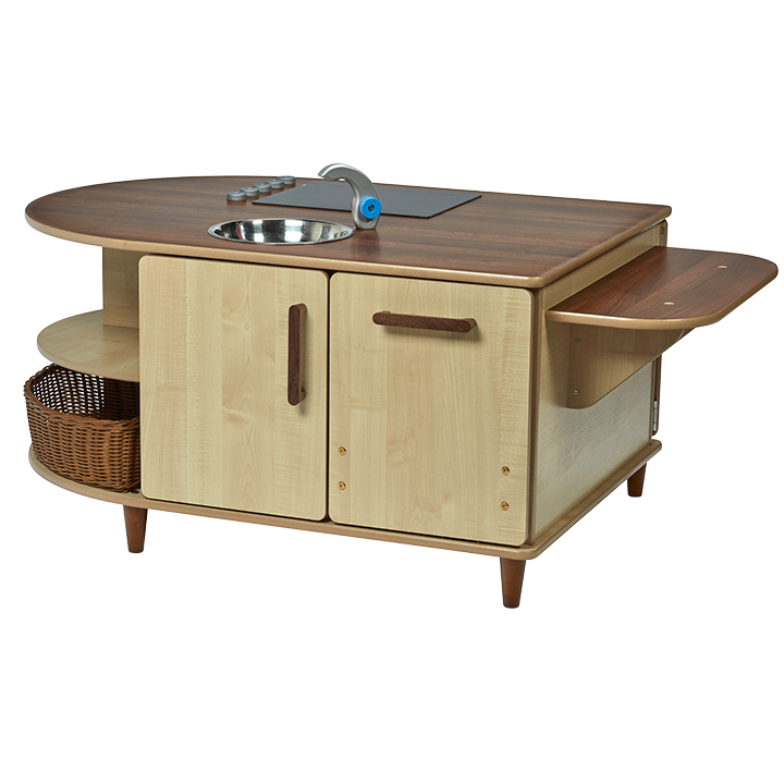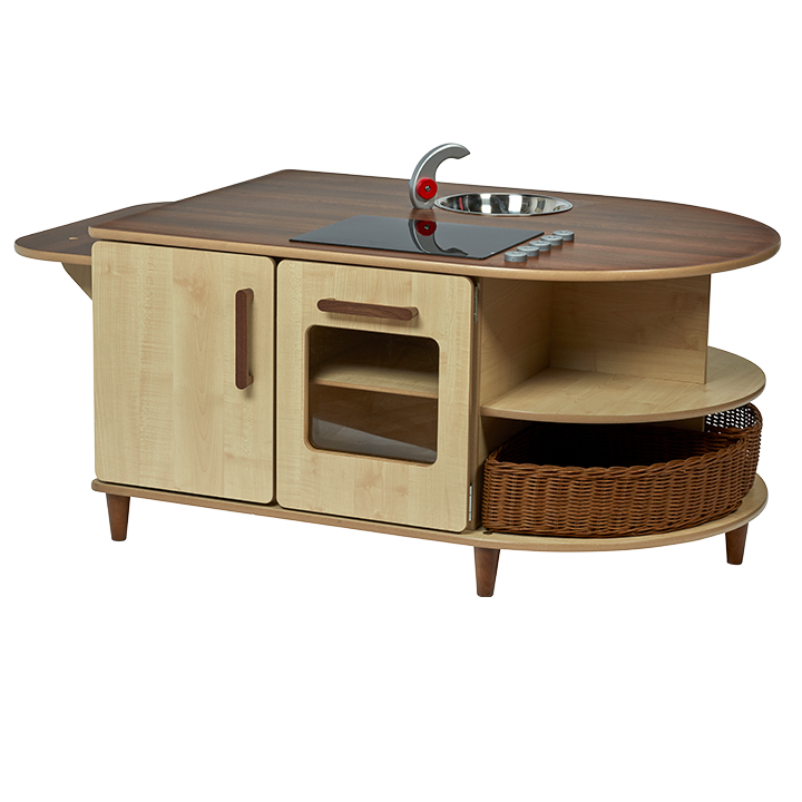 Cooker, removable sink, oven, three storage cupboards, four corner storage shelves and breakfast bar at one end.