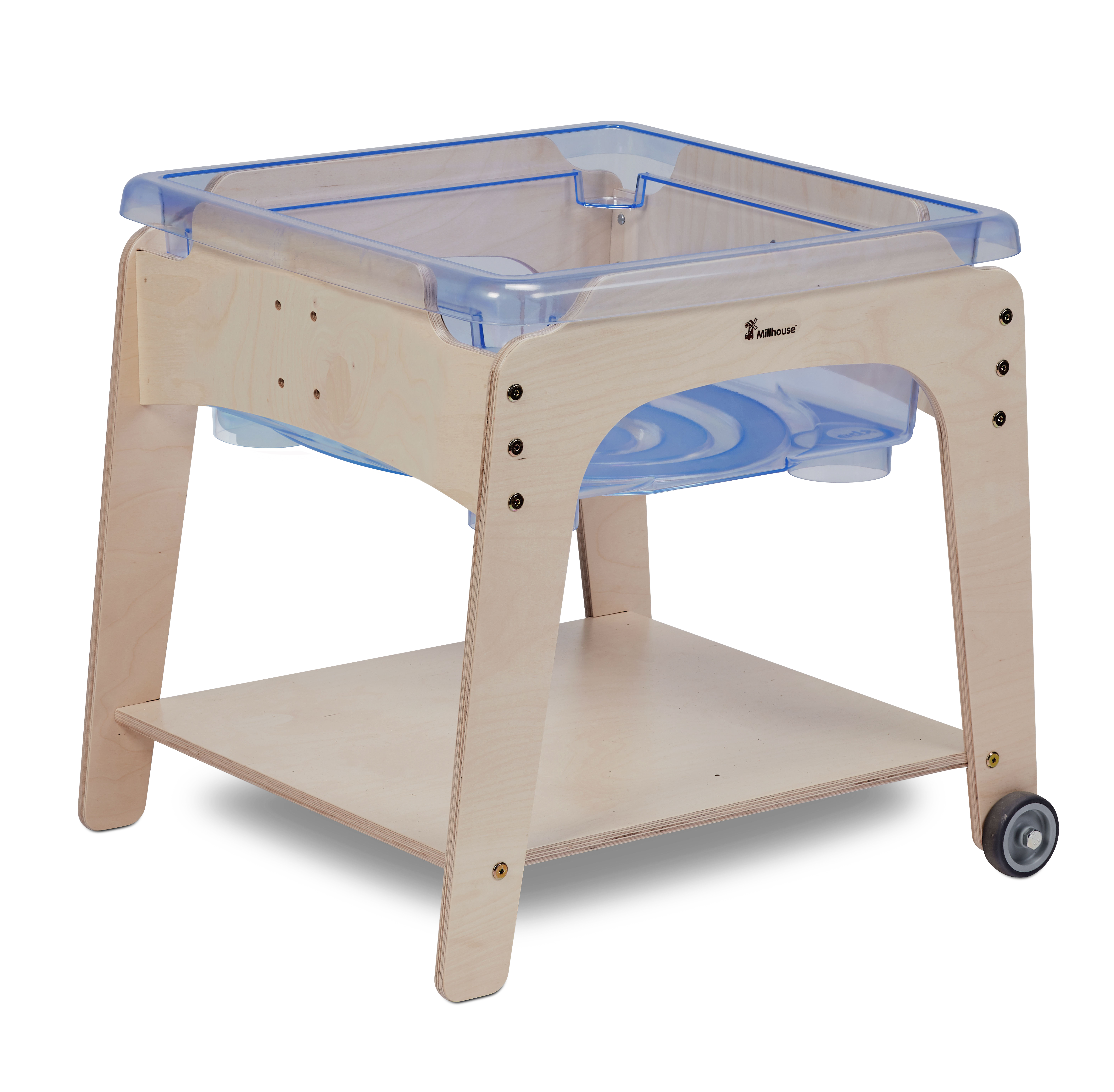Sturdy frame with two wheels and two fixed legs and polycarbonate tray. Trays have a screw-on bung for emptying water. Supplied with a wooden lid, which can be used as a work surface.