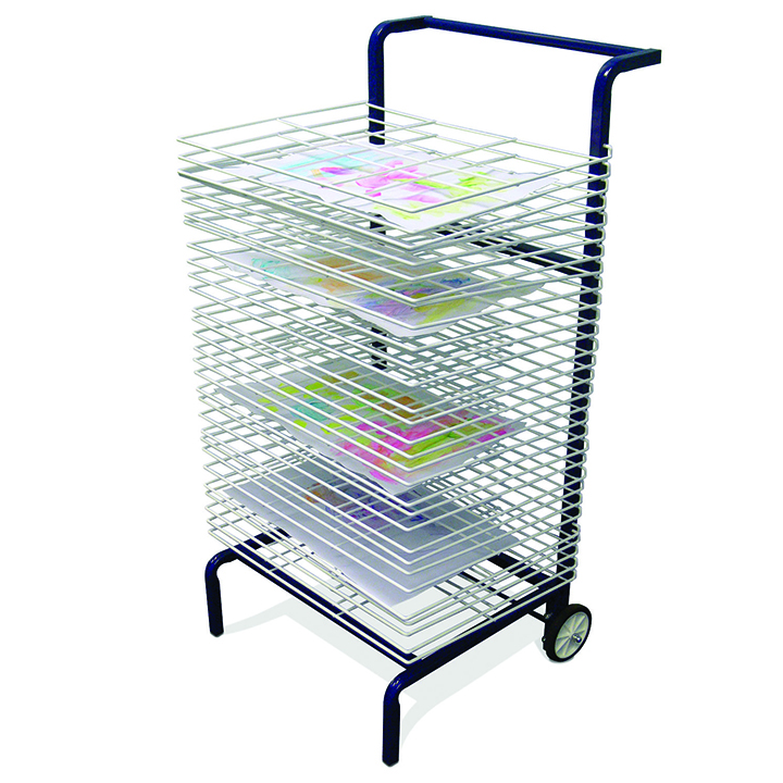 Heavy duty spring loaded drying unit. Comes with 2 castors so the unit can easily be moved between classrooms. Takes up to A3 size paper and is epoxy coated for easy cleaning. Spring system keeps the shelves in place when loading or unloading paintings.