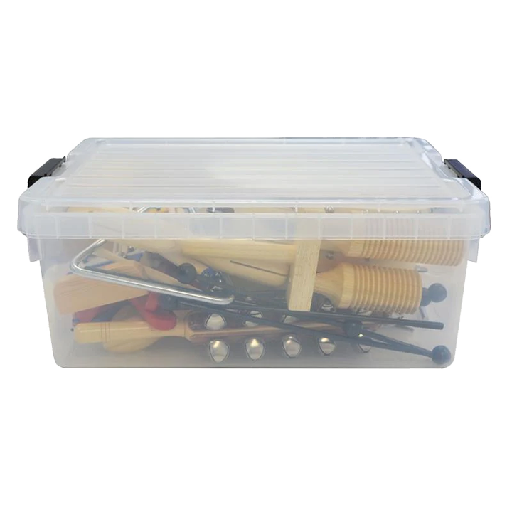 Pair of wooden handled maracas, 2 plastic castanets, 4 triangles with beaters, 2 five handbell sets, sleigh bell, wooden block with beater, jingle stick, 8 note glockenspiel with two beater, 2 three handbell sets, 3 pairs of black beaters, 2 long handled castanets, double agogo with beater, T block with beater, 2 headed tambourines